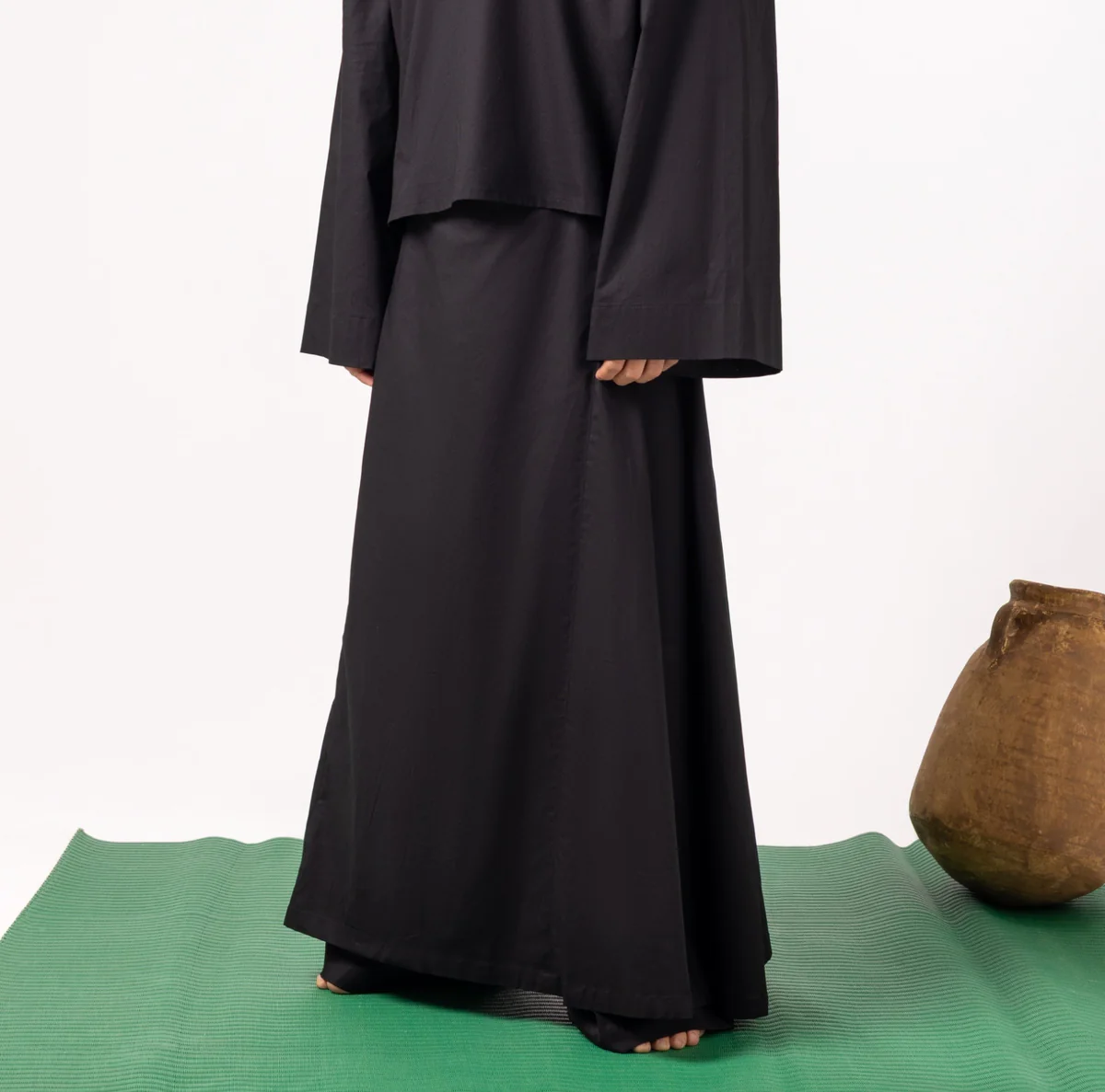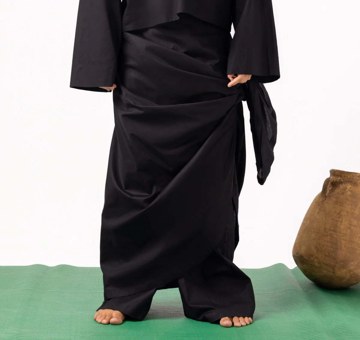 Inspired by the way Egyptian farmers would knot their galabeyas while working the land, the Sa’Ala Pants pay tribute to function as tradition. Cut in sturdy black fabric, they feature a signature loop-and-pocket detail that allows an extra panel of fabric to be tied up — echoing the sa’ala gesture with intention.