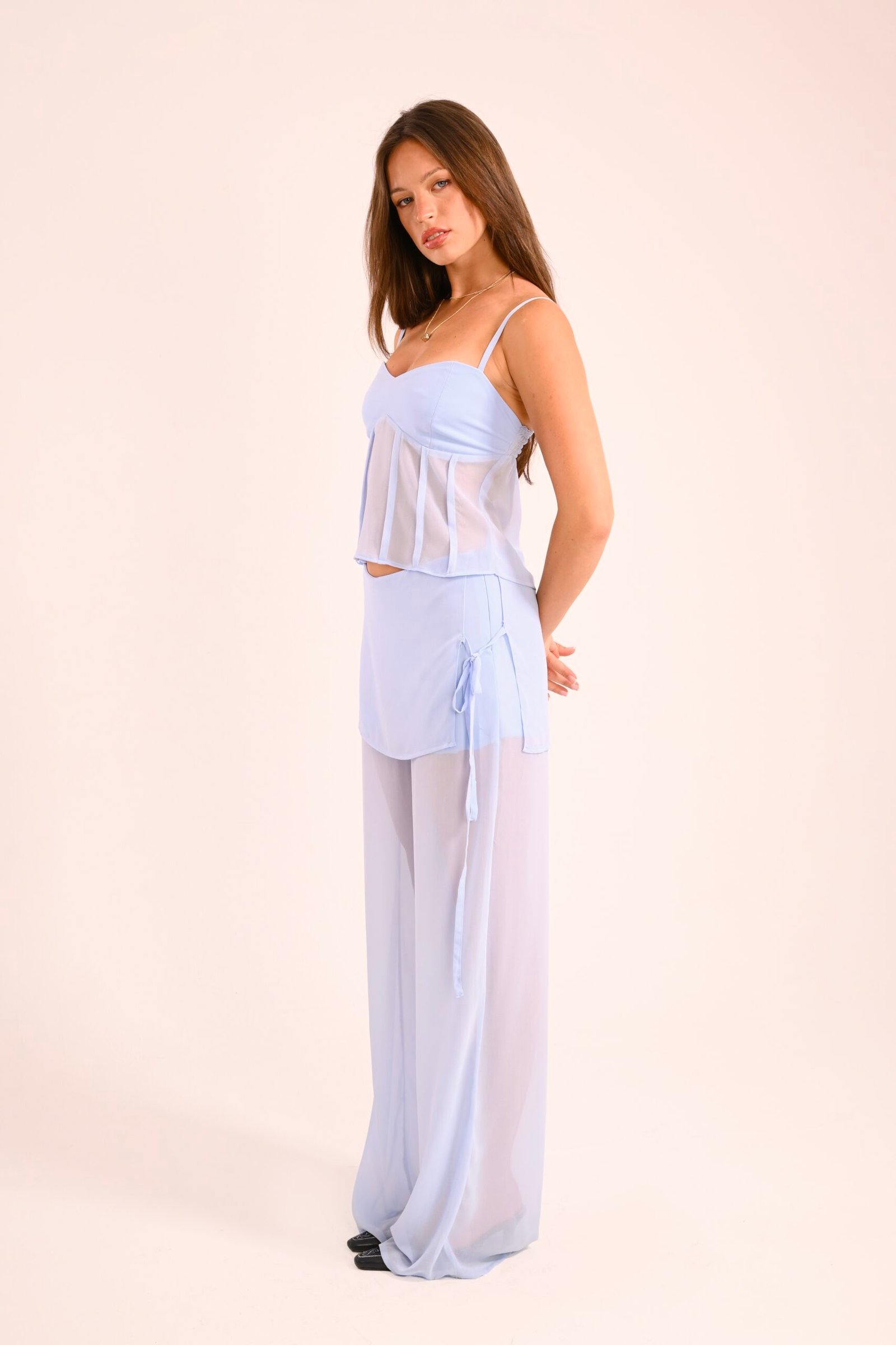 Crafted in soft chiffon with a relaxed, fluid silhouette, the Blue Reverie Co‑ord Set embodies easy sophistication. The look pairs low‑rise wide‑leg chiffon pants with an integrated mini skirt overlay tied at the side, and a structured bustier style bodice with ruched peplum for feminine definition. Both the top and pants are thoughtfully lined for comfort and confidence — the top from the bust and the pants with mini shorts underneath — ensuring a seamless and flattering fit.