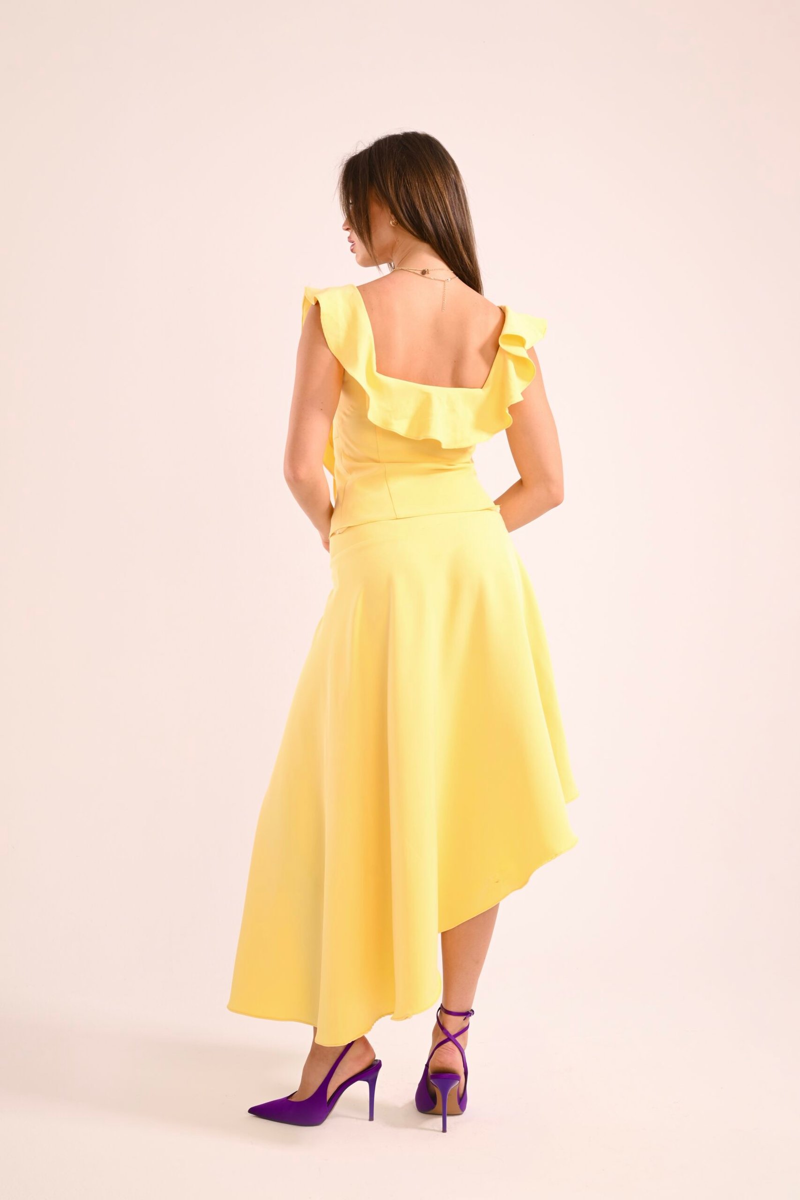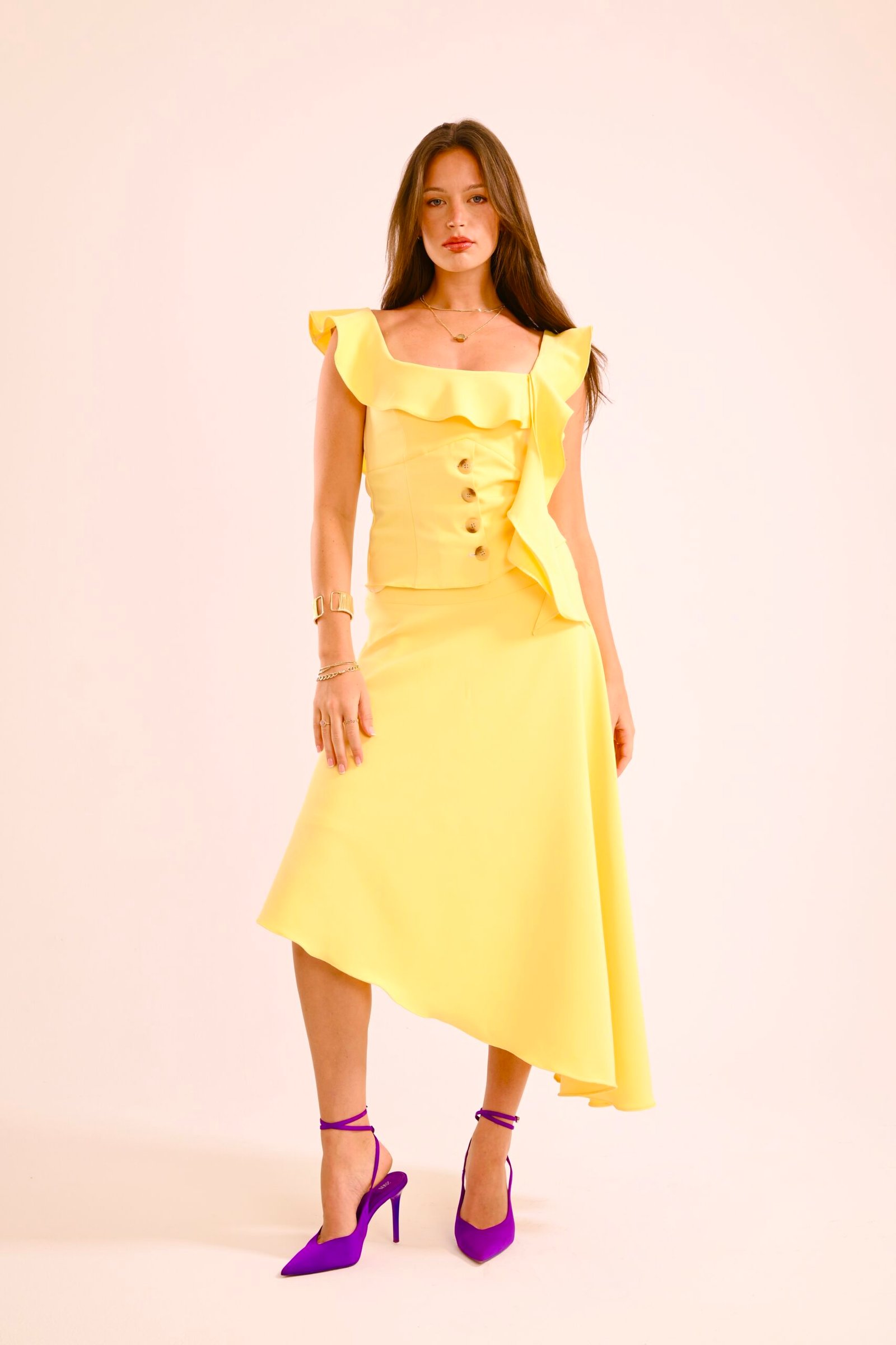 Crafted from premium crepe fabric, this coordinated set combines structure with soft drape for a flattering and contemporary silhouette. The square neckline top is enhanced with subtle ruffle trimming and detailed with four front buttons for a refined finish. The asymmetrical maxi skirt sits low on the waist and is accompanied by a mini skirt lining with a side zipper, offering both movement and comfortable coverage. Perfect for styled looks from brunches to evening soirees.