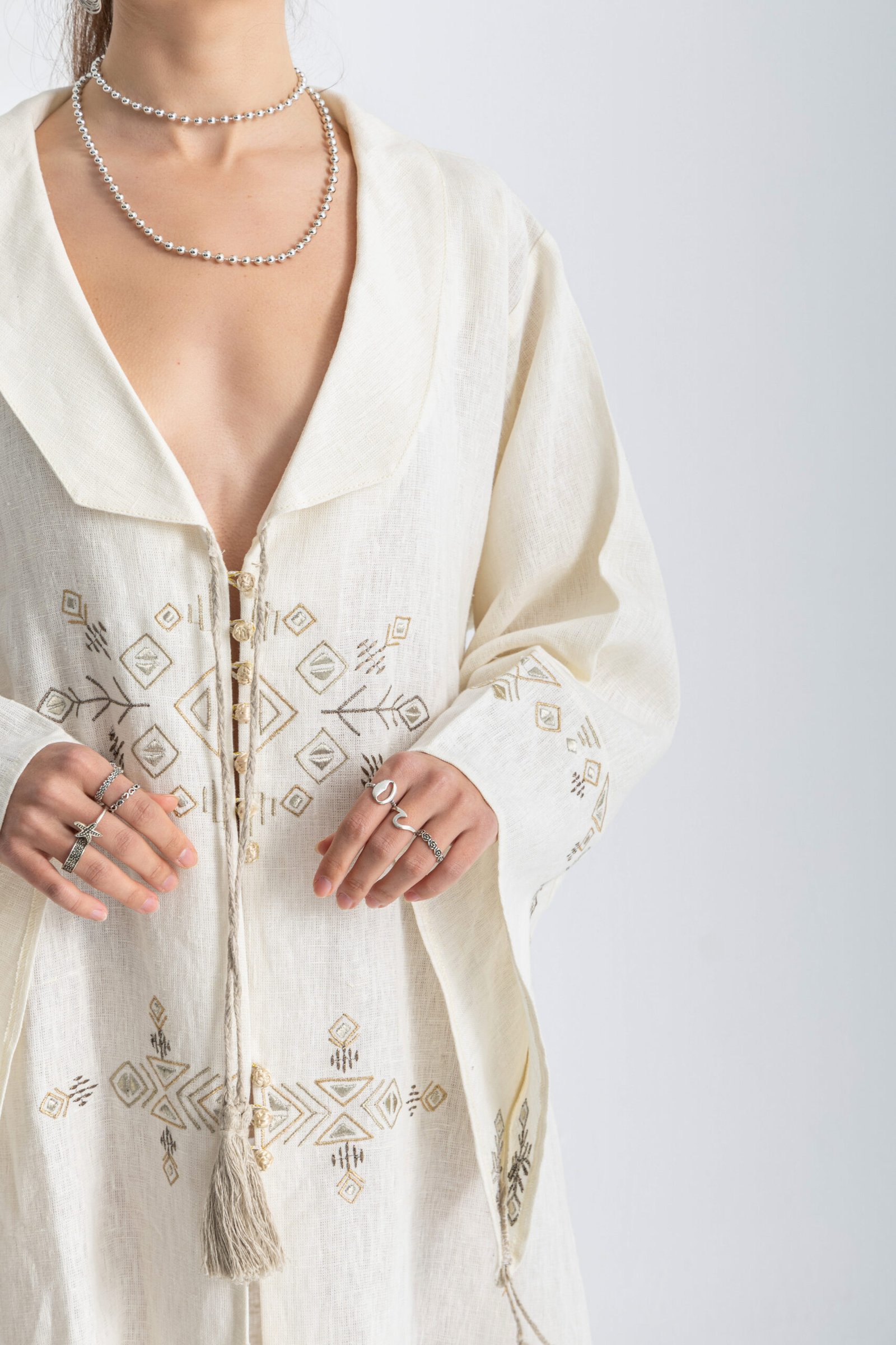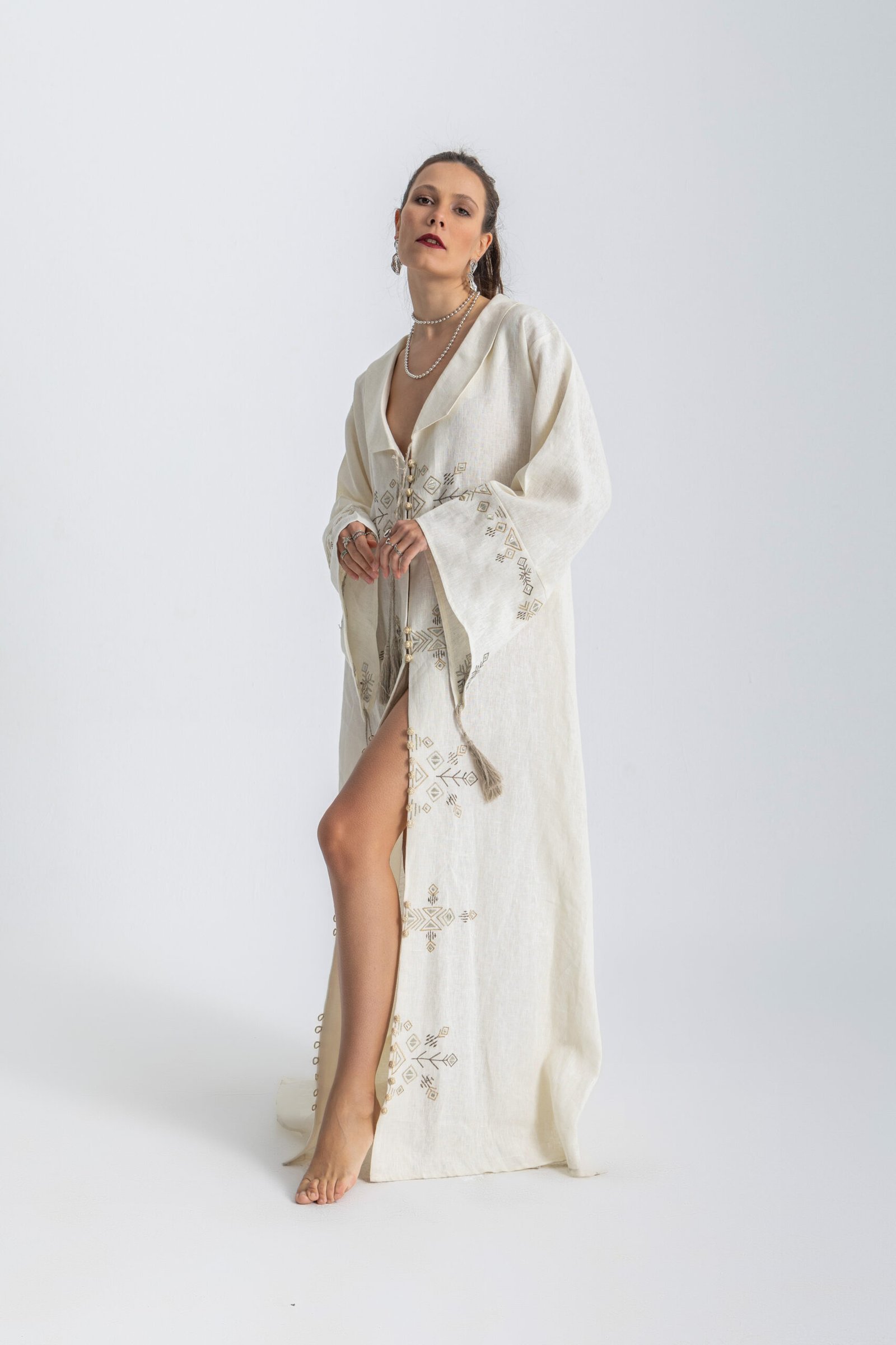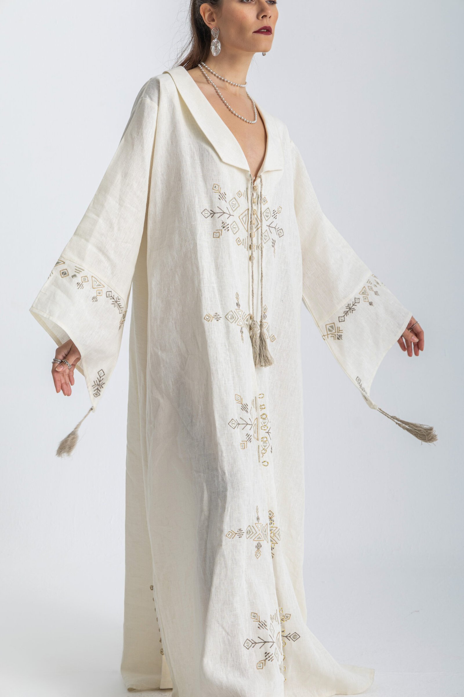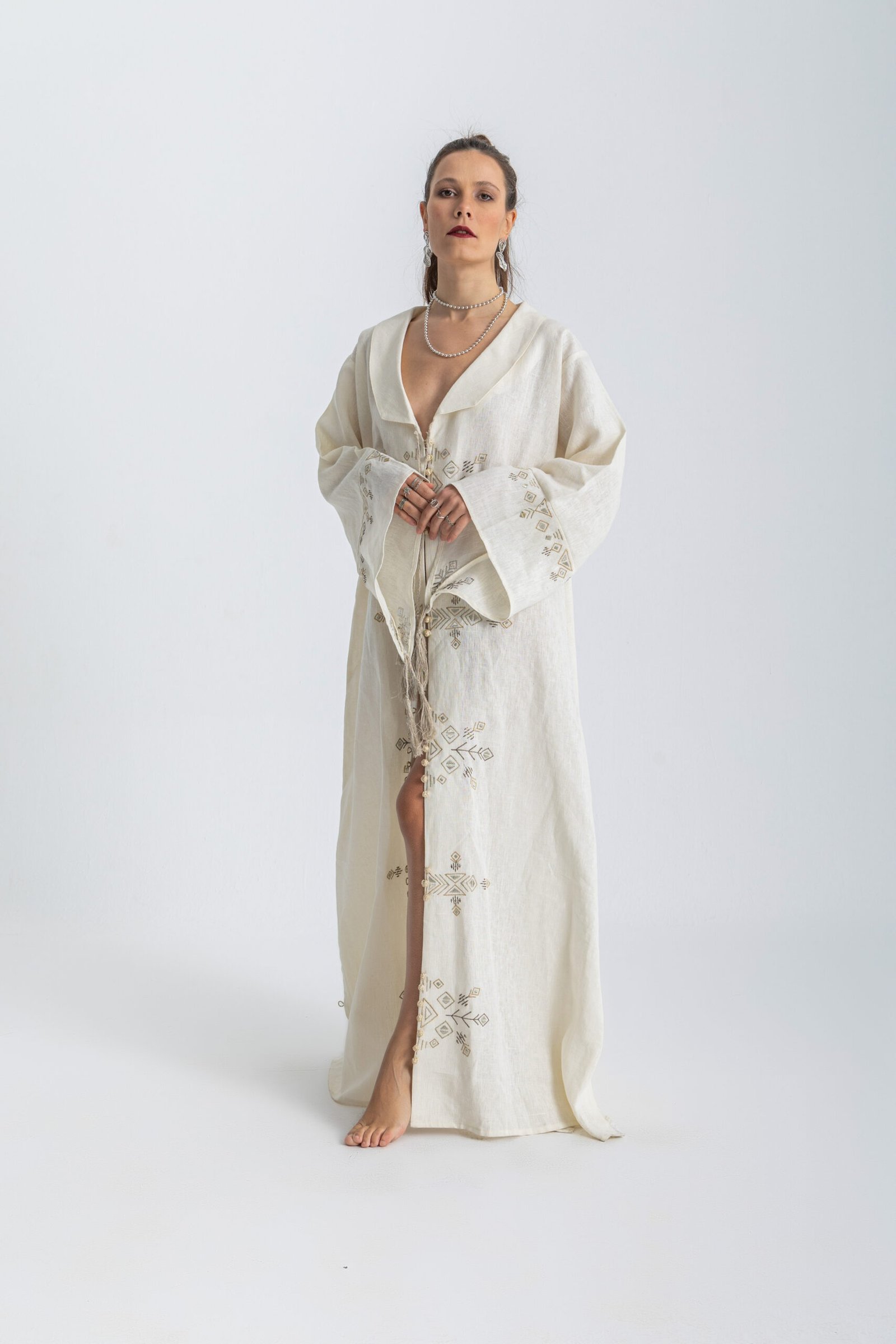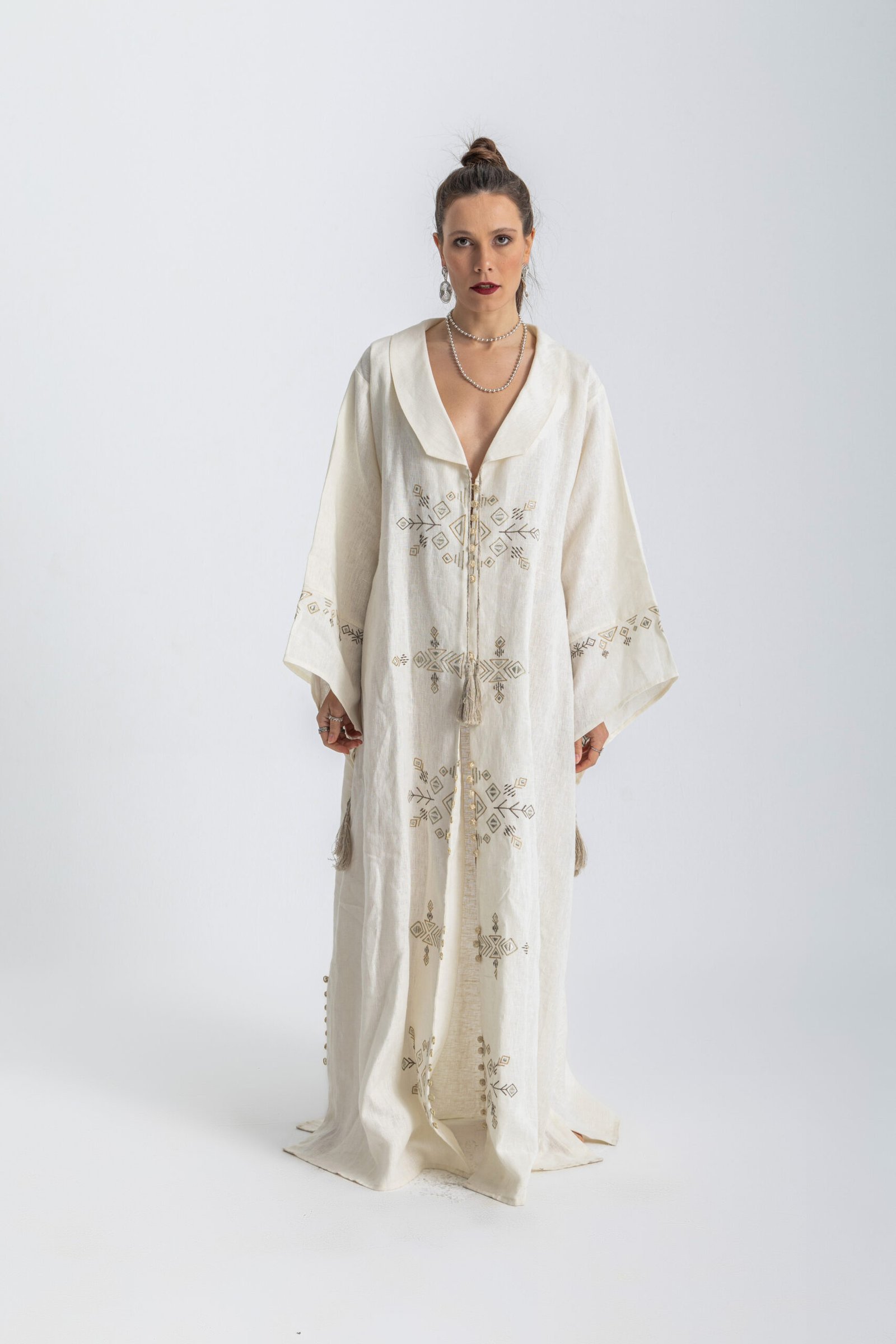 Collared embroidered linen abaya.