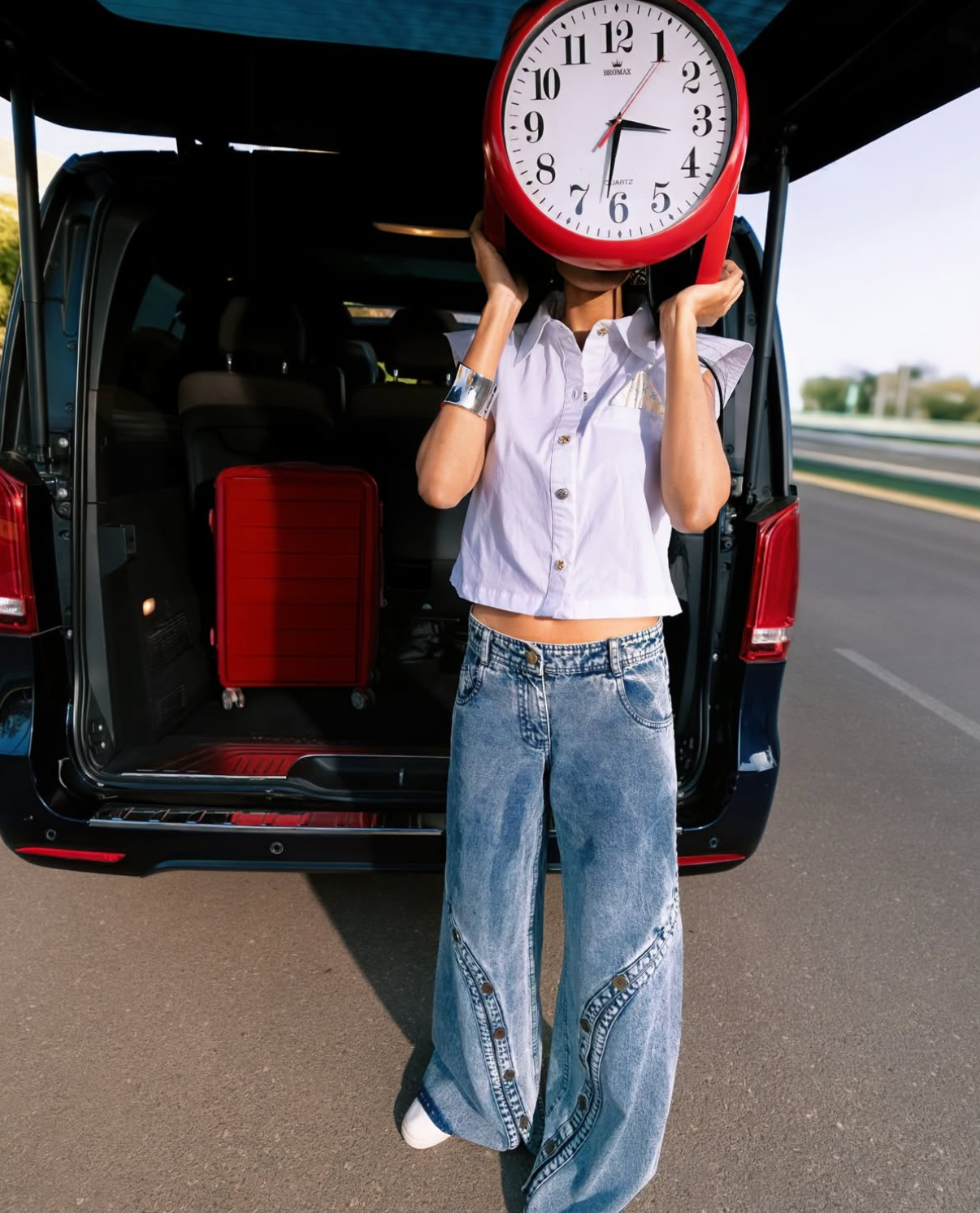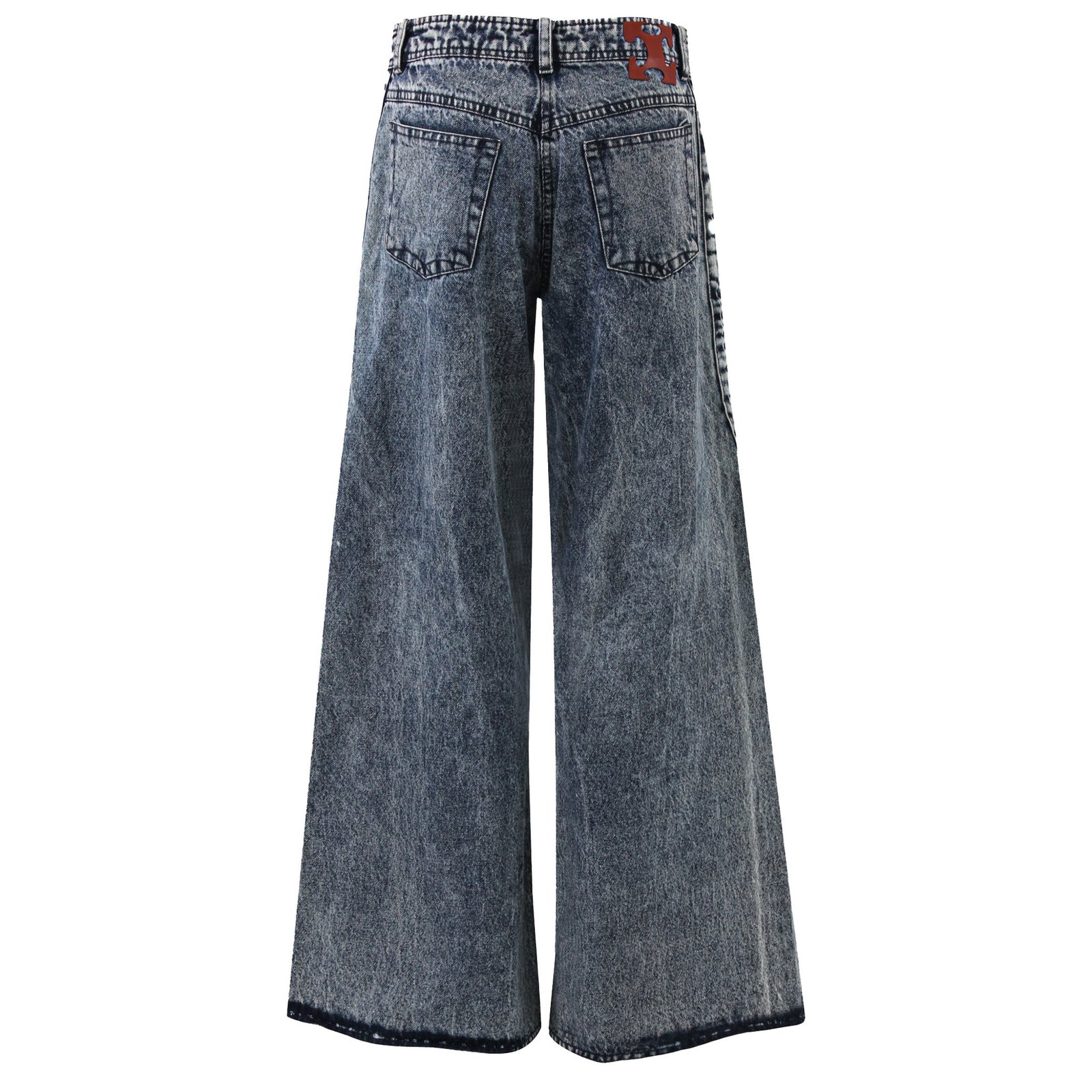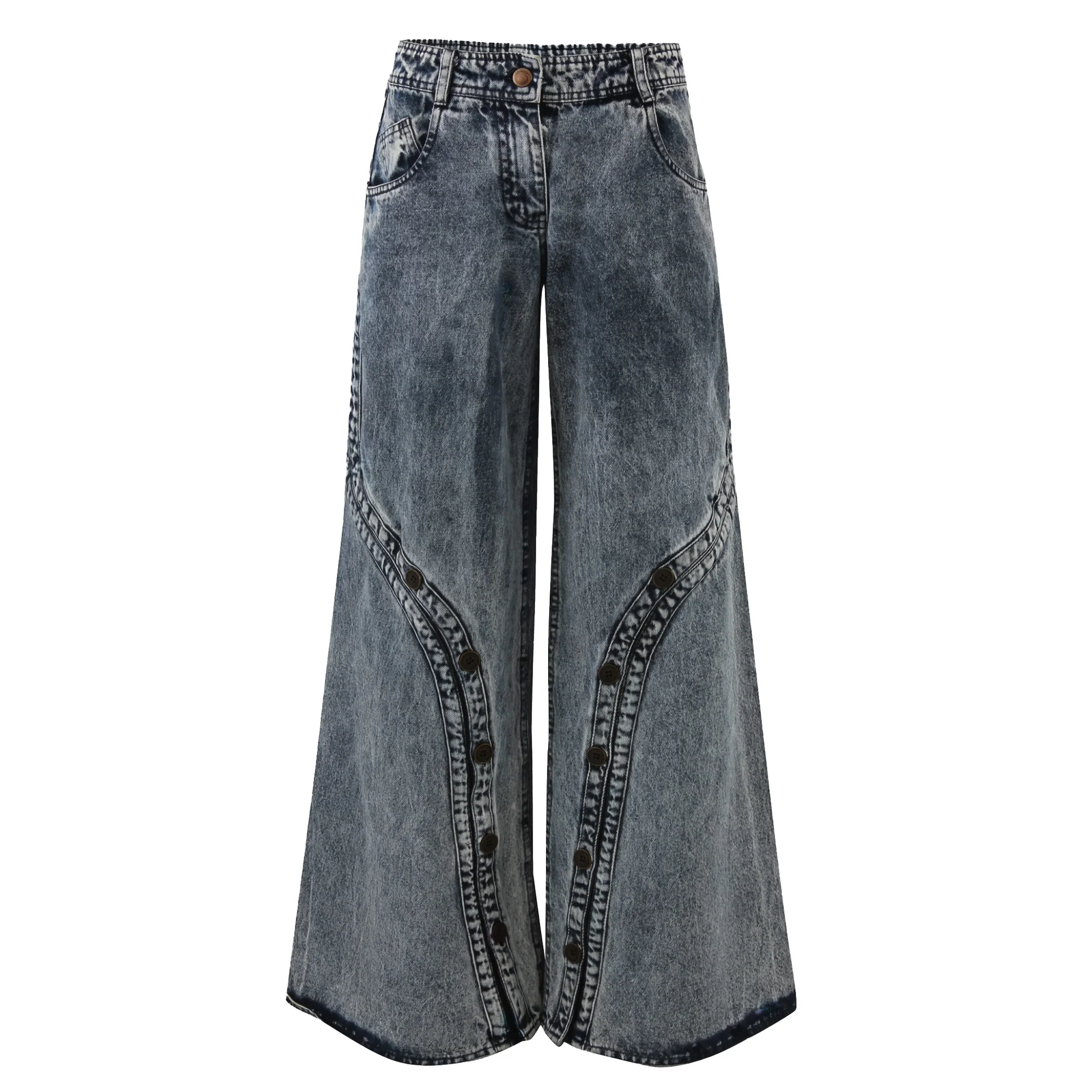 Crafted in premium denim, these wide‑leg pants present a statement‑making profile defined by an S‑shaped button closure along the front. Wear them fully fastened for a sleeker silhouette or partially open for a more relaxed, fluid aesthetic. The broad legline delivers effortless movement and forward‑thinking style — perfect for both streetwear‑inspired looks and elevated casual outfits.