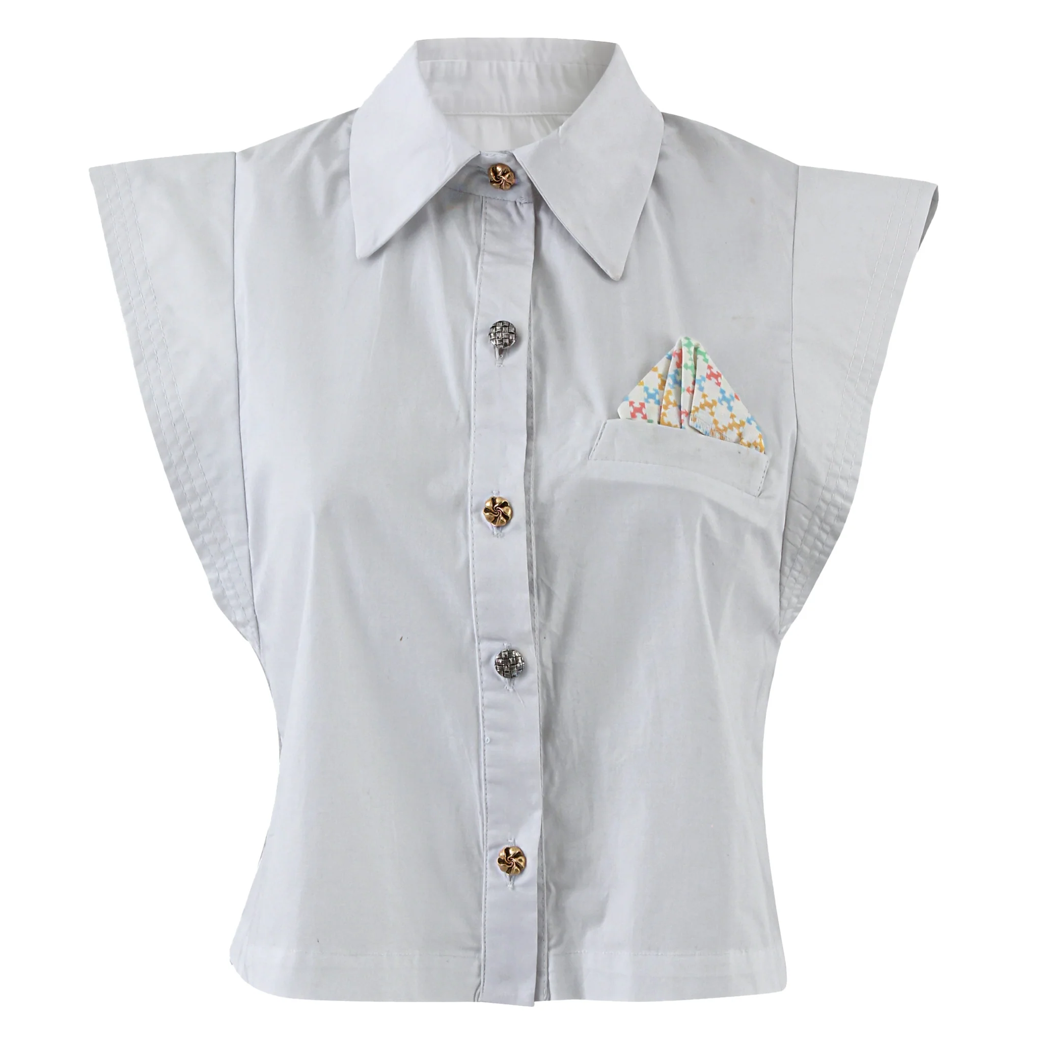 The Chemystery Top brings crisp sophistication to everyday dressing. Designed with structured shoulders and sharp lines, this piece reinvents the white shirt with a modern edge. Silver and gold contrast buttons create a bold dual‑metal accent, while the tailored cut delivers a refined yet assertive silhouette — ideal for both workwear and stylish evening styling.
