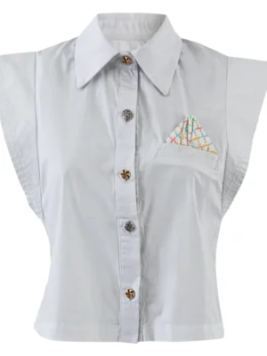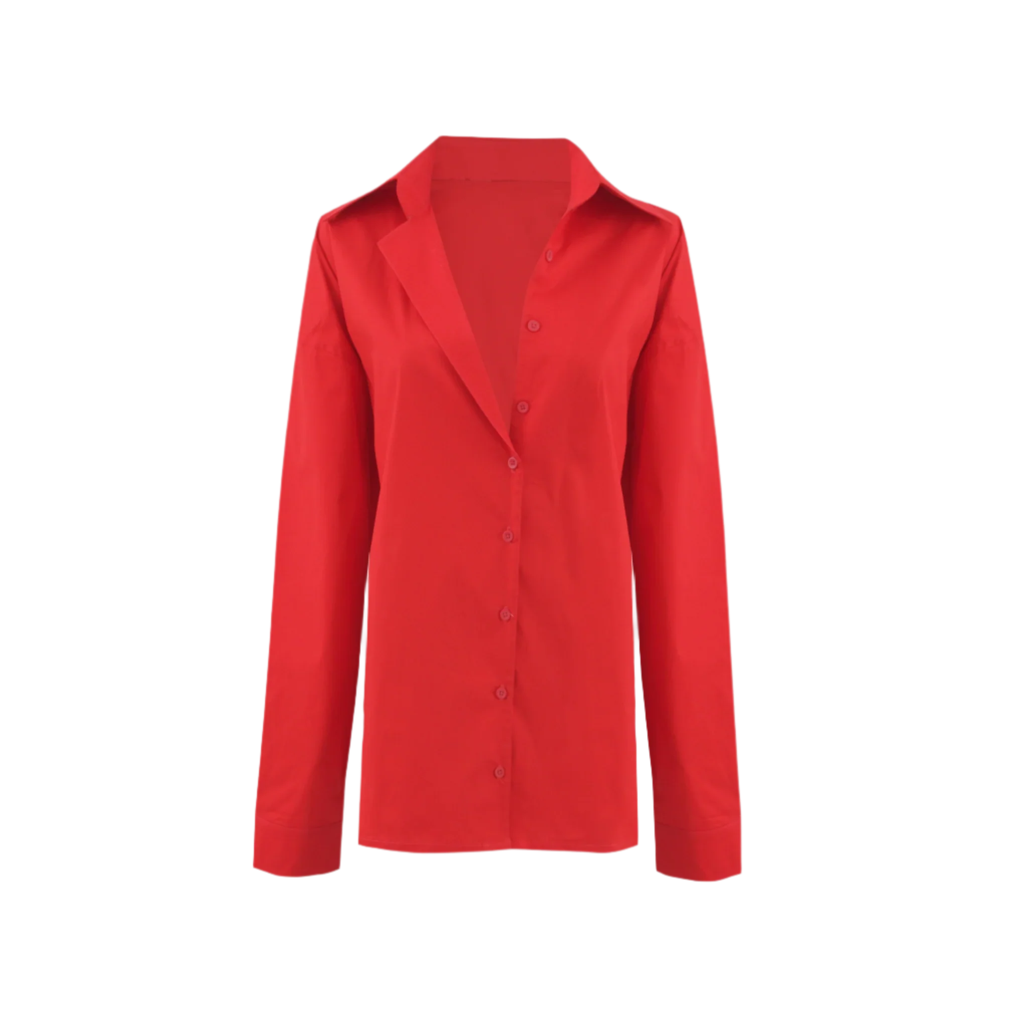 The Asymmetrical Chemise Shirt combines traditional shirt structure with modern design elements. It features a slightly elongated hem with asymmetrical cuts, a tailored fit through the torso, and crisp fabric that maintains its shape. Fully lined where needed for comfort, this piece balances sophistication with contemporary style, making it versatile for layering or standalone styling.